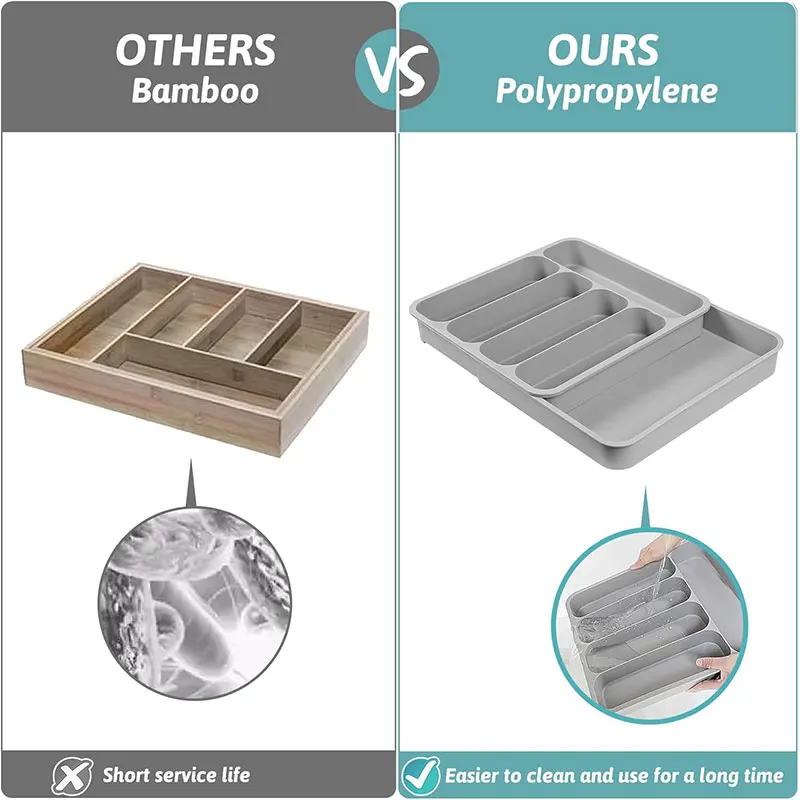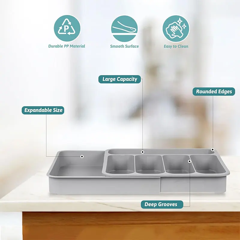 - Premium-Qualität: Du erhältst einen ausziehbaren Besteckkasten für Schubladen. Hergestellt aus hochwertigem PP-Material in elegantem Grau, langlebig und BPA-frei. Hochdichter Kunststoff verhindert, dass Flecken an der Oberfläche haften bleiben – einfach per Hand oder in der Spülmaschine zu reinigen.